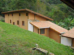 Descrição. Respeitando a topografia acidentada do terreno, a casa foi dividida em dois blocos, em níveis diferentes, para minimizar a movimentação de terra. Com isso ganhamos uma clara divisão entre áreas íntima e social, em concordância com os desejos da família para uma casa de fim de semana.
